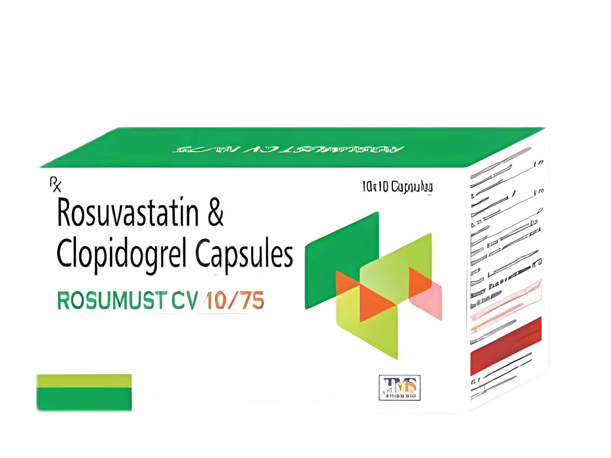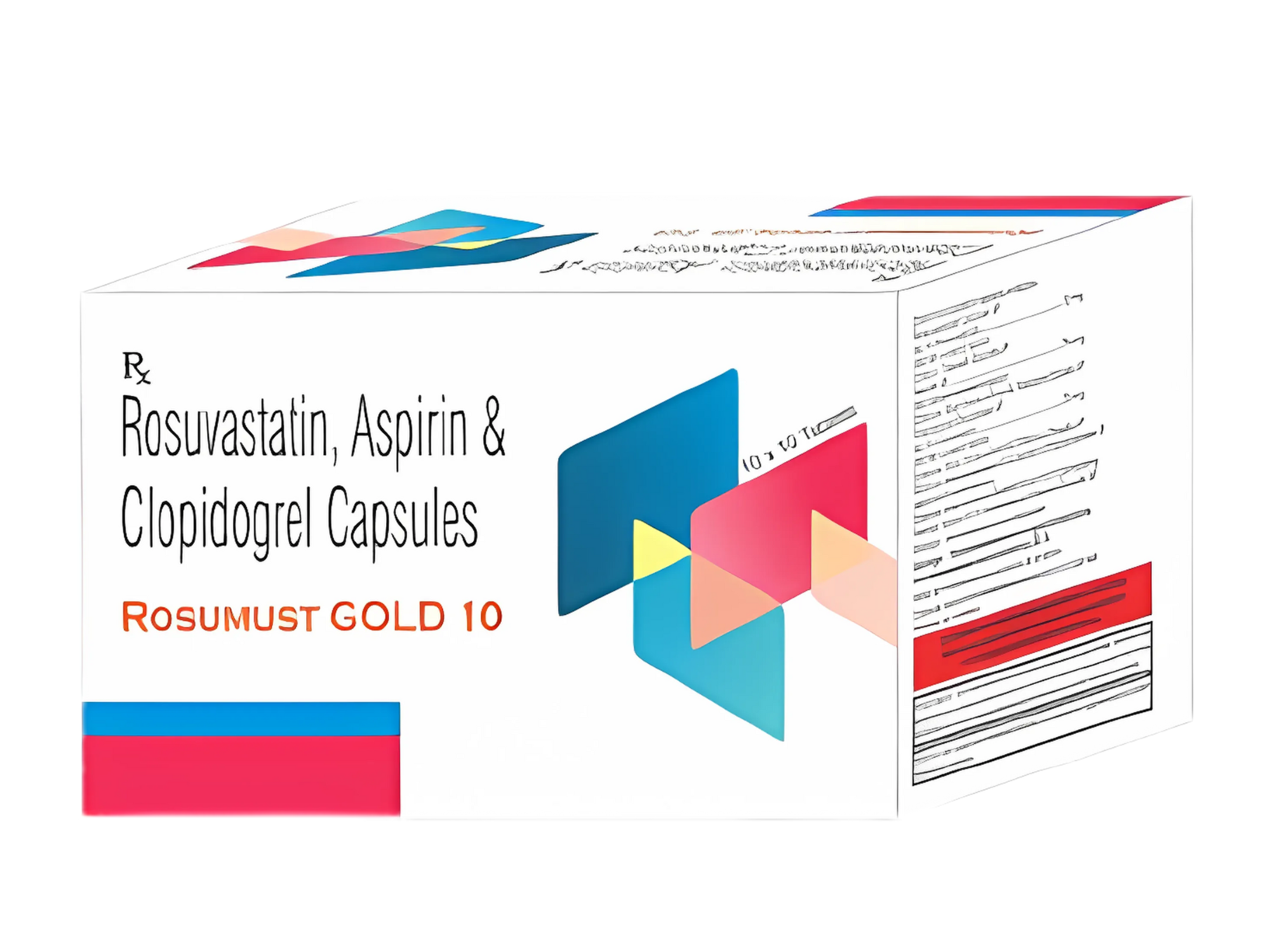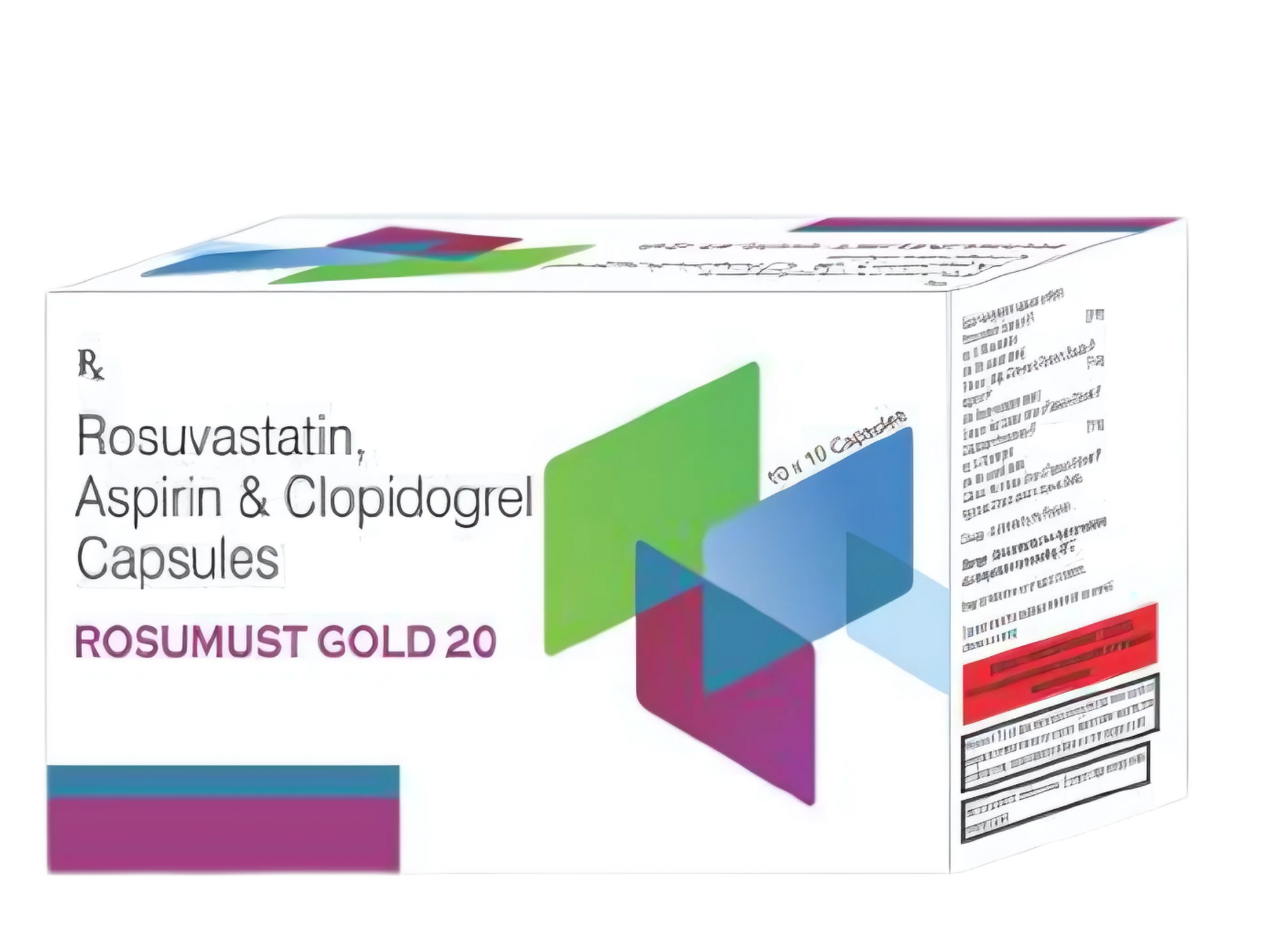 ROSUMUST GOLD 20 CAP provides intensive cardiovascular protection through a potent mix of rosuvastatin, clopidogrel, and aspirin. It reduces cholesterol and prevents blood clots, making it ideal for patients with a history of heart disease. Clinical monitoring is essential for safe and effective use.