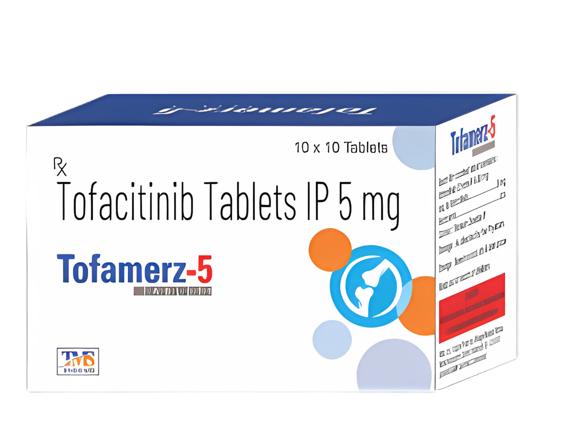 TOFAMERZ 5 TAB contains Tofacitinib 5 mg, a Janus kinase (JAK) inhibitor used to treat rheumatoid arthritis and other autoimmune conditions. It controls inflammation and joint pain effectively and improves mobility in patients unresponsive to conventional DMARDs.