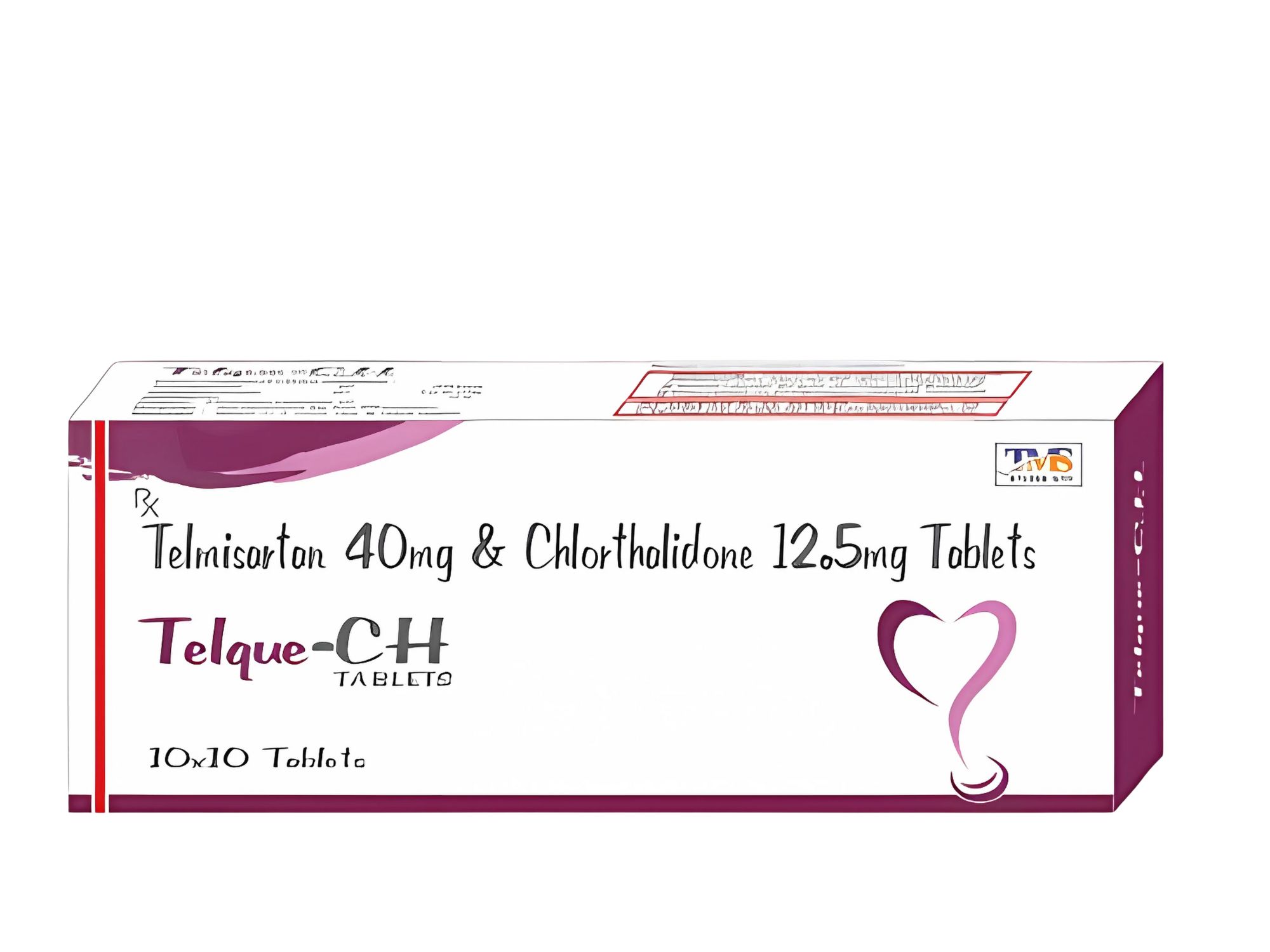 TELQUE – CH TAB contains Telmisartan and Chlorthalidone, combining RAAS inhibition with a potent diuretic effect. It helps manage fluid retention and controls blood pressure in patients with volume-dependent hypertension or those unresponsive to monotherapy.