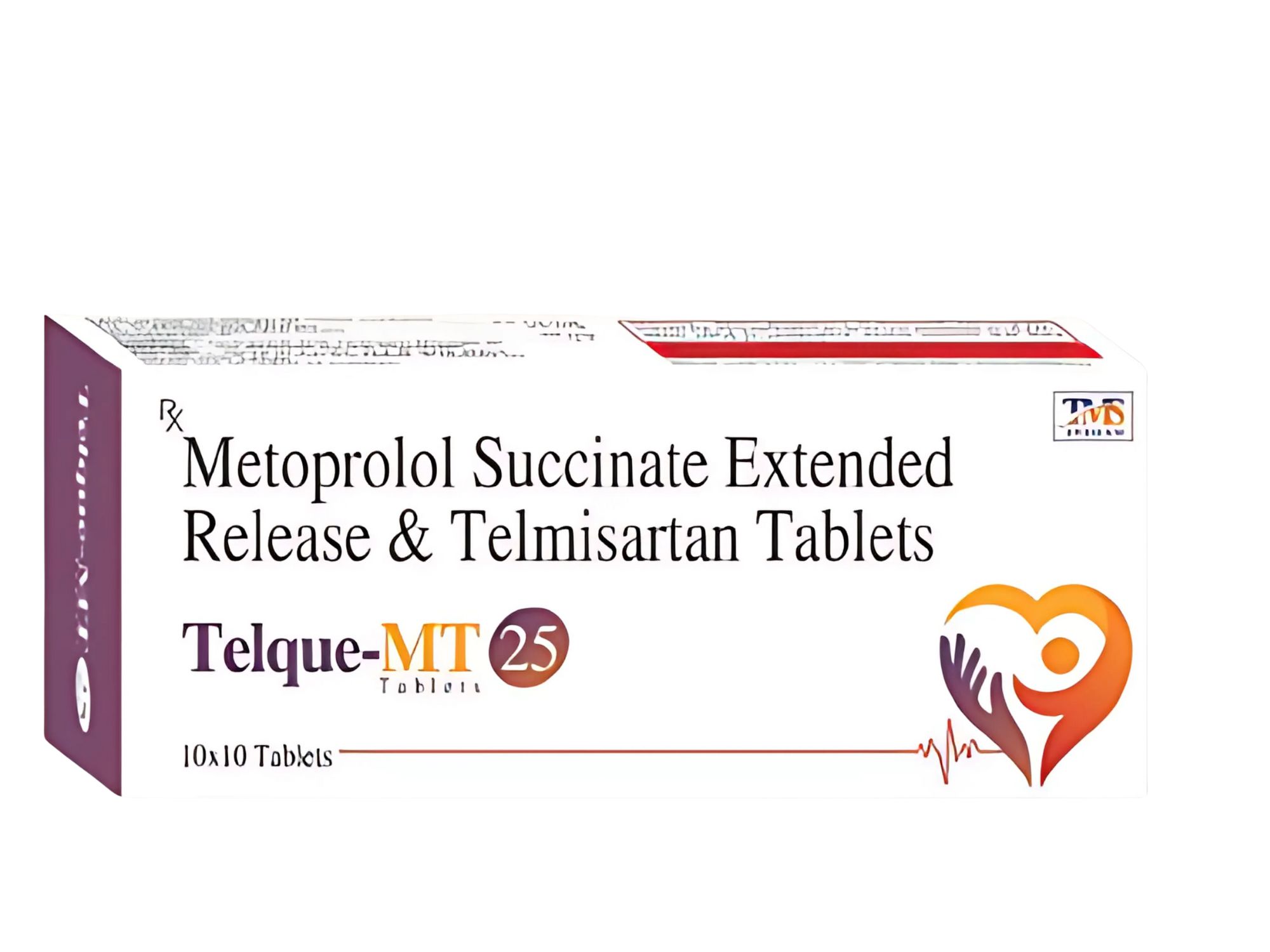 TELQUE – MT 25 TAB blends Telmisartan with Metoprolol 25 mg, offering both vasodilation and beta-blocking action. It’s suited for patients with hypertension and a history of heart disease. The formulation supports rate control and protects the heart from stress-related damage.