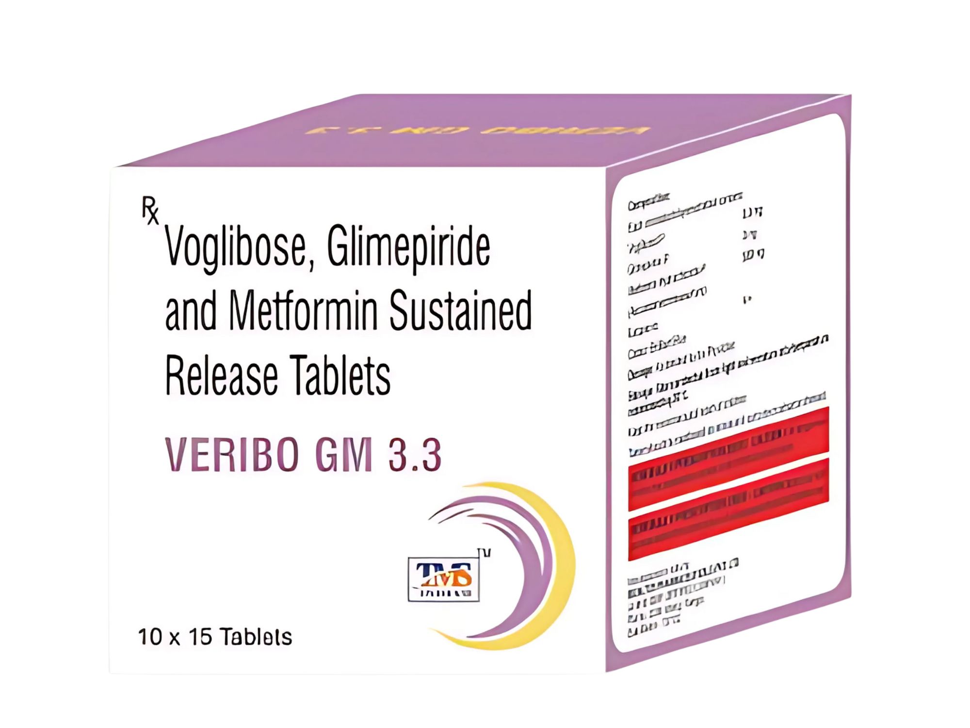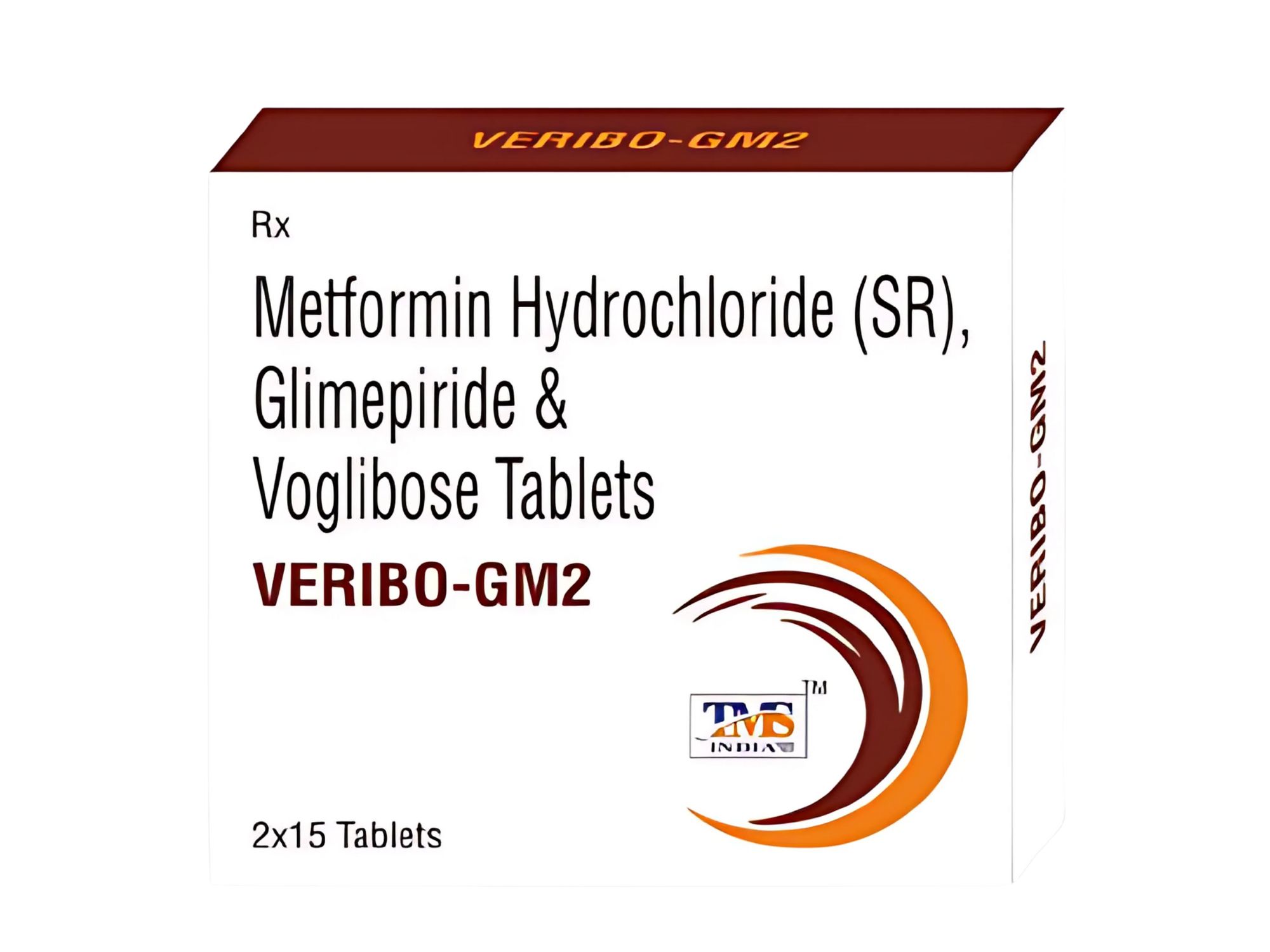 VERIBO GM 2 TAB is a triple combination of Glimepiride, Metformin, and Voglibose. It controls both fasting and post-meal glucose, making it suitable for patients with high glycemic variability. It promotes insulin action and reduces glucose absorption in the intestines.