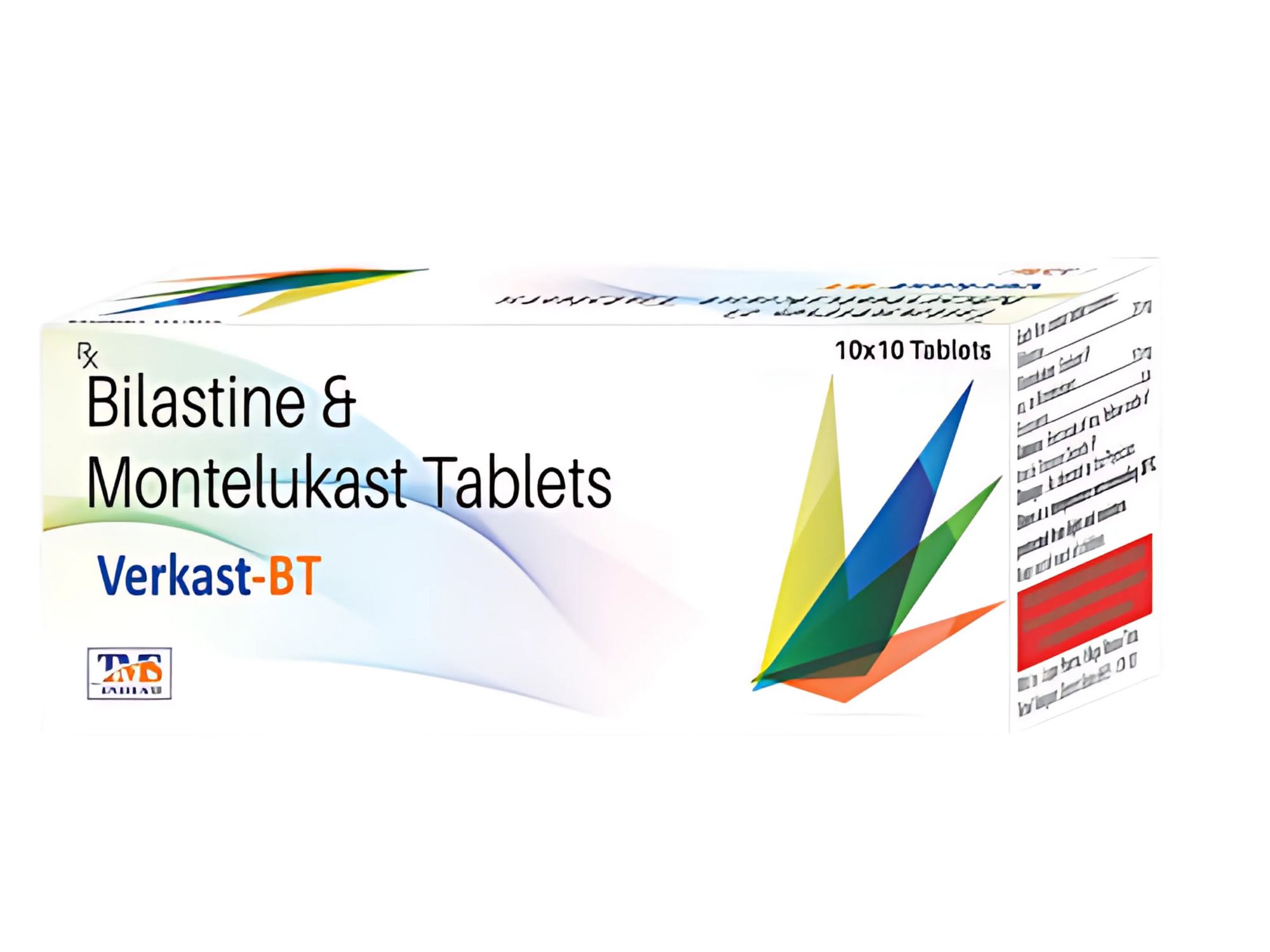 VERKAST BT TAB is a dual-action allergy relief medication combining Bilastine and Montelukast. It treats allergic rhinitis, chronic urticaria, and asthma symptoms. It relieves sneezing, nasal congestion, and wheezing, with minimal sedation and long-lasting action.