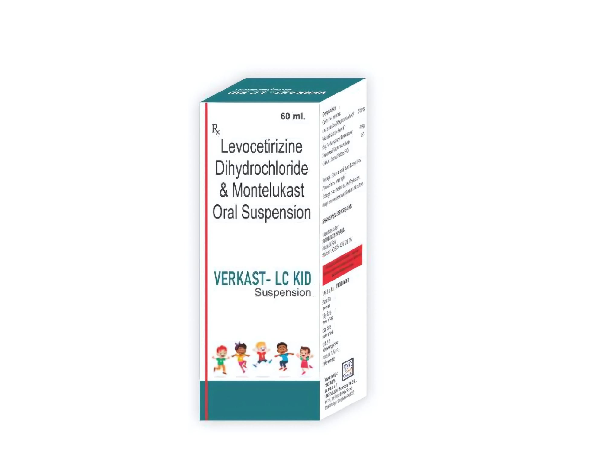 VERKAST LC KID SYP is a pediatric formulation of Levocetirizine and Montelukast. It relieves allergy and asthma symptoms in children with minimal sedation. The syrup form ensures easy dosing, improving compliance in young patients.