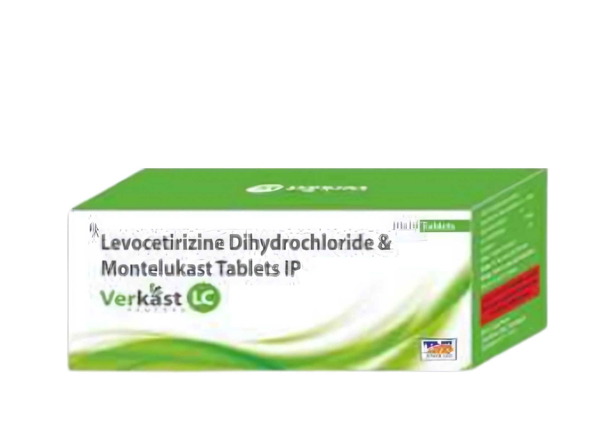VERKAST LC TAB is a fixed-dose combination of Levocetirizine and Montelukast, offering dual relief for rhinitis, asthma, and allergies. It blocks histamines and leukotrienes, reducing inflammation and bronchospasm. Suitable for long-term allergy and asthma control.