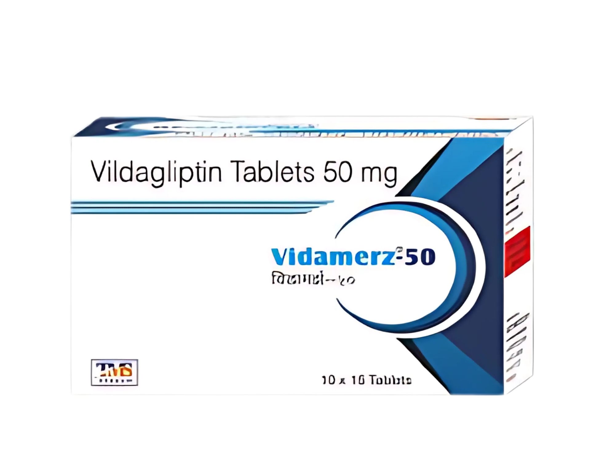 VIDAMERZ 50 TAB contains Vildagliptin 50 mg, a DPP-4 inhibitor for Type 2 Diabetes. It improves pancreatic beta-cell response, enhancing insulin release and reducing glucagon levels. It supports glycemic control without weight gain or hypoglycemia.